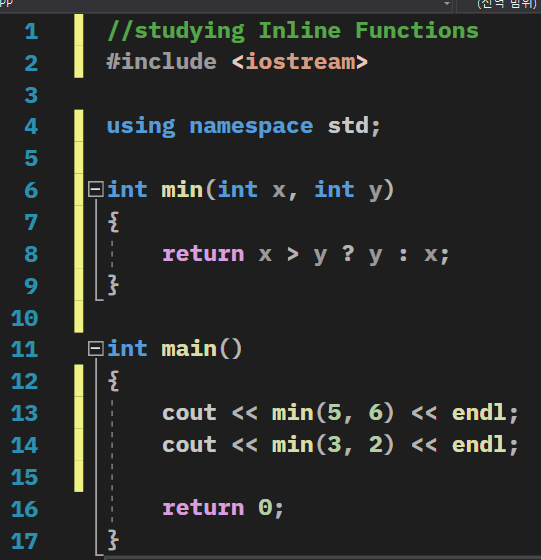 λ ν κ°μ§ λ¨μ μ λ§μ½ min κ°μ inlineμΌλ‘ λ ν¨μκ° μμ² λ§κ³
